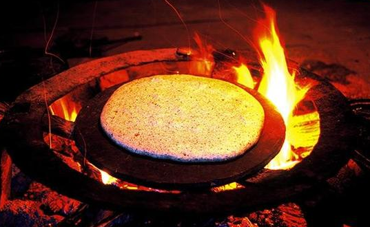 在貢山縣丙中洛地區(qū)有一種特殊的石板,可用刀削,石板呈青色,經(jīng)火烤之后堅(jiān)硬不裂,并有一層油亮光澤。當(dāng)?shù)嘏迦罕姀氖蠢锿诔鍪^后用刀剝開,削成圓狀當(dāng)鍋用??爵昔螘r(shí)只要將蕎面、包谷面、麥面調(diào)成糊狀后倒在燒燙的石板上,反復(fù)翻烤5分鐘之后即可食用,不需加任何佐料,這樣烤出來的粑粑,香甜酥脆,保持面粉的原汁原味,是貢山怒族待客的一種簡易食品。在丙中洛的“農(nóng)家樂”中,你就可以現(xiàn)場看到“石板粑粑”的做法,并親口嘗嘗熱氣騰騰的“怒江石板粑粑”。