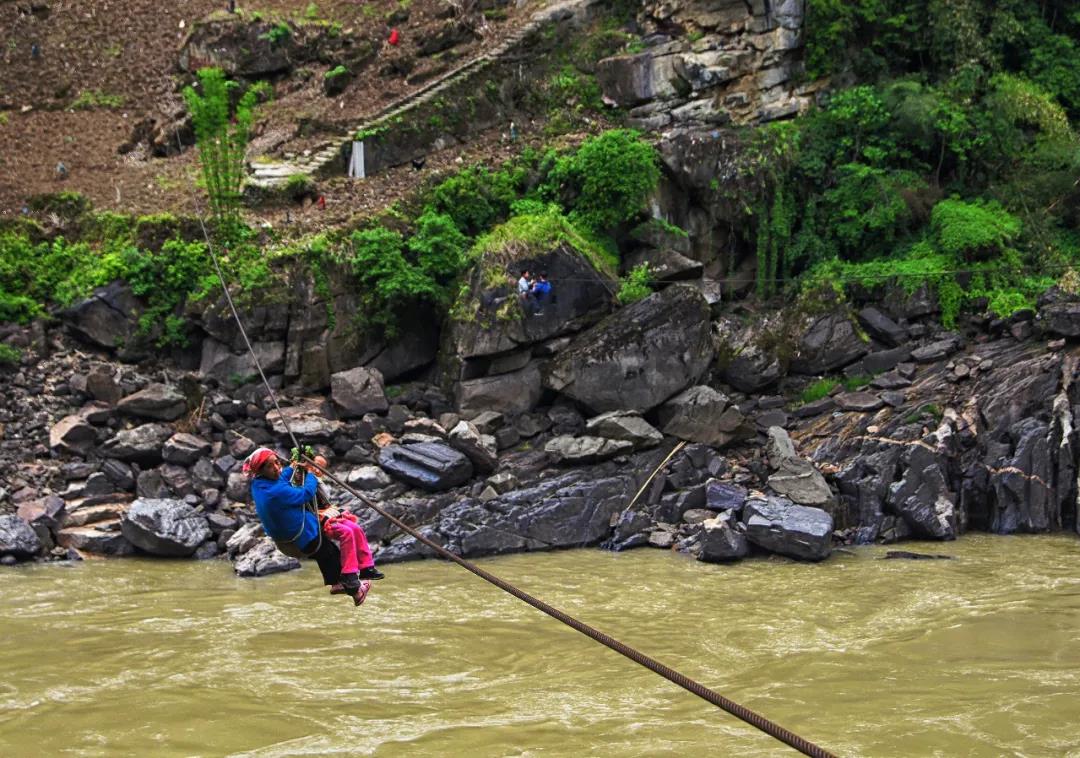 而過(guò)河更是兇險(xiǎn),用藤條拴在兩岸的木樁上,要過(guò)河的人則把繩子系在腰間,再利用兩岸的落差飛快地劃過(guò)去,但落水的風(fēng)險(xiǎn)大,甚至常有人被湍急的水流帶走。