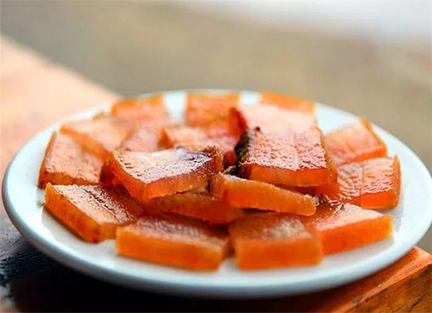 琵琶肉是一種用傳統(tǒng)腌制方法制作而成的肉品。具體方法是豬屠宰后將其內臟和骨頭取出,保留完整軀體。待其稍涼后,撒入花椒面、草果面、食鹽等佐料及白酒,輕輕搓揉后,將其開口縫合,在縫線部涂敷上水或香油調好的灶灰,并用木塞或玉米芯把豬鼻塞嚴,以防蟲蛀。然后用石板或木板壓上晾干,干后形似琵琶,故名“琵琶肉”。琵琶肉的制作歷史悠久,保存時間長,若不切開,三、四年不變味。琵琶肉肉色透明,色鮮味香,風味獨特。