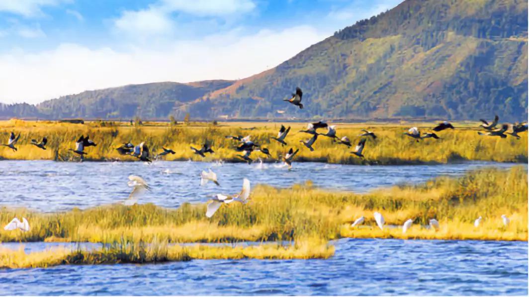 “海子大可千畝,中皆蕪草青青,下如草浮結(jié)而成者,亦有溪流貫其間第不能起......”這是徐霞客對騰沖北海濕地的描寫。大概意思是一片片草甸靜靜地漂浮在水面上,盡管溪流貫穿其間,奈何草根緊緊地交錯(cuò)在一起,卻怎么也濺不起水花,更別說把草甸掀起來了。