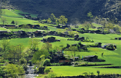 形成了一塊12000多畝的緩坡壩子,丙中洛美麗、古樸、寧靜,它四面環(huán)山,梯田廣布,村落毗連